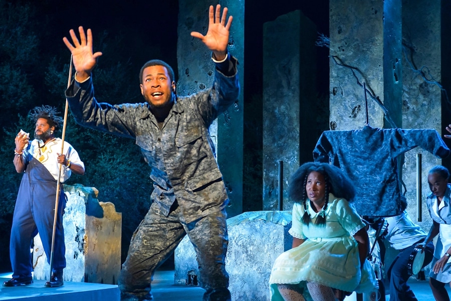 “I love the notion of retelling a story and adding your own thread to it,” says Gardley, who himself was born and raised in Oakland. “This piece in particular, I’ve always loved the Odyssey, and what I love so much about it is that it’s an epic, in which it goes on these tangents, these beautiful tangents. It just to me expresses the free nature and the largeness of story telling told in the oral tradition. African American storytelling originated in this way as well, and so I thought, I was trying to bring those two elements together.” The two traditions intertwine, with characters Paw Sidin standing in for Poseidon, and Aunt Tina for Athena. “He’s a soldier who served in the Iraq war, there is a subtle inference that he could – may be suffering from PTSD, but that’s never mentioned. But his journey, unlike Odysseus is one in which he’s travelling in his own blood. So his own blood is like the sea, if you will, and his own blood is African-American history. So he’s traversing through African-American history to find home.” As an adaptation, he felt the story could go anywhere, while still keeping true to the known elements of Homer’s original. “I’ve stayed faithful. The characters, the sort of monsters and creatures from the Odyssey all have been changed. There’s some semblance of them from the original, but they all have been changed for my own making and flavor.” It was written when Gardley lived in Harlem, and the first production in Denver had Harlem as Lincoln’s home. “I loved that production, but I also felt like, ‘this doesn’t feel like home to me.’ And so when I had the opportunity to do it at Cal Shakes, I just changed everything, and now this is where it will stay.”